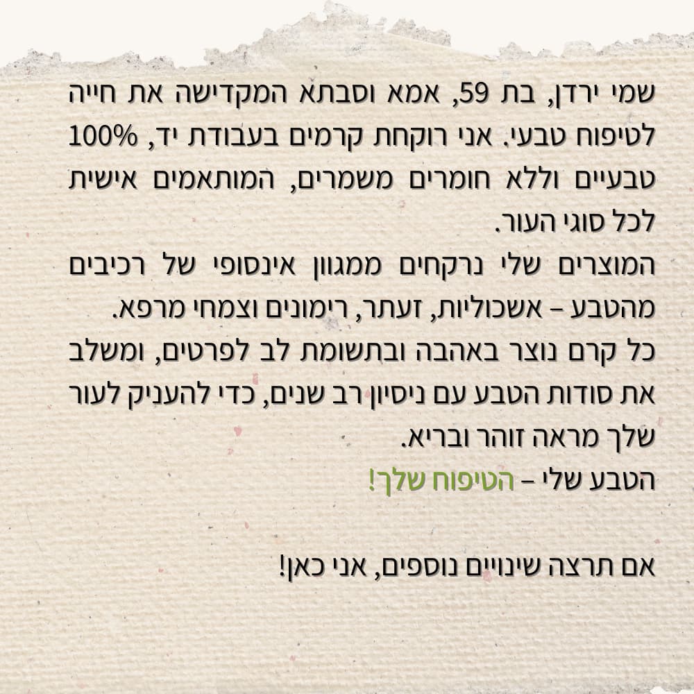אני, ירדן, רוקחת מוצרי טיפוח טבעיים, המציעה קרמים ומשחות 100% טבעיים